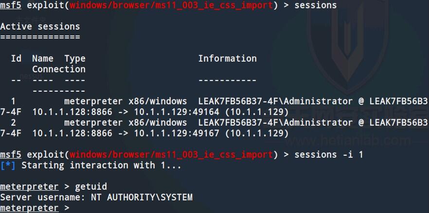 12.验证攻击是否成功。列出当前成功建立的回话,任意进入一个回话,查看攻击者的身份。可以尝试使用getsystem进行进一步的提权,如果提权失败则可以采取上传提权exe程序进行提权的方案获得最高权限。