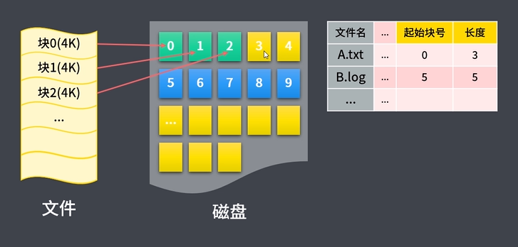 连续分配--->记录起始块号和长度,将文件分成多个逻辑块,然后连续分配在磁盘的物理块,优点是支持顺序访问和直接访问,缺点是扩展文件不方便,有可能产生磁盘碎片(外部碎片:由于过小而不可用的外存)