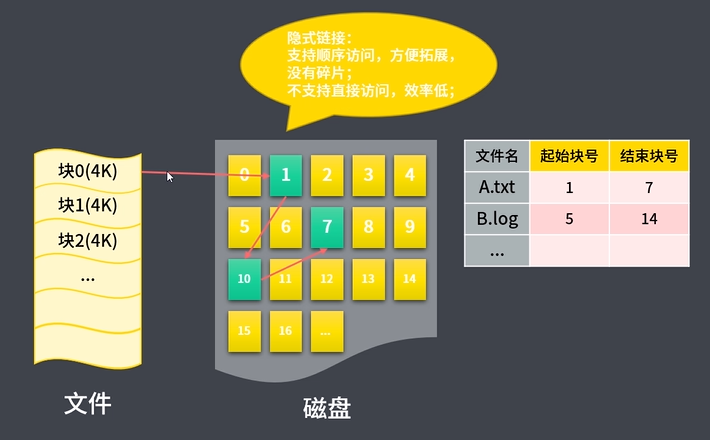隐式链接如下(不给文件分配表,通过当前块才能访问下一块):