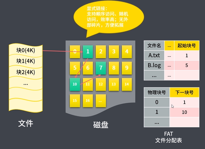 说明:a.前面的隐式链接是必须把第一个块读出来才能找到下一块,而显示链接有一个表来给出下一块的地址