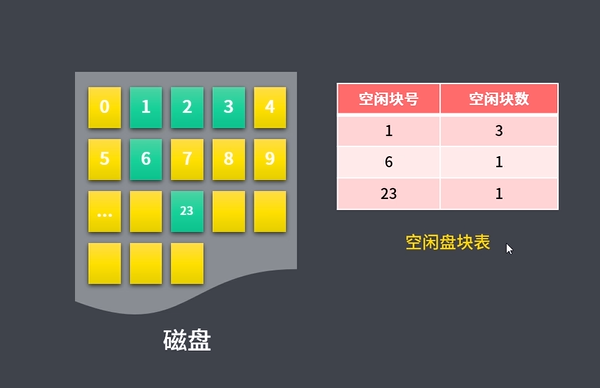 空闲表法:建立空闲盘块表,将连续空闲块的首个块号和带上首个的连续总空闲块记录,适用于连续分配方式