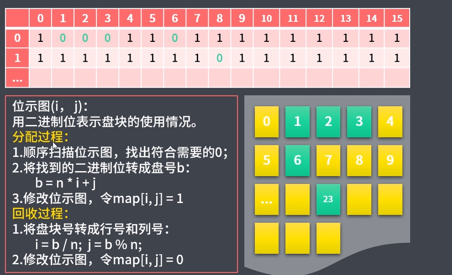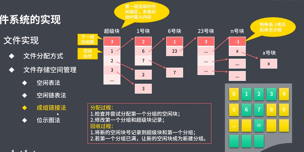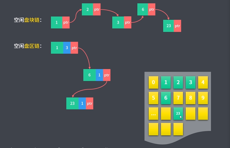 空闲链表法:一种记录每个盘块,一种记录连续盘区