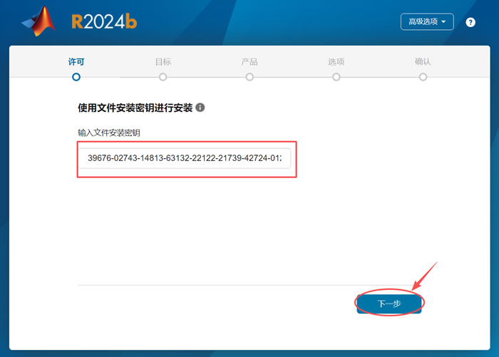 9) 粘贴到 “输入文件安装密钥” 里,点击 “下一步”: