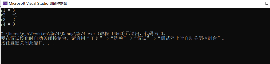 #include <stdio.h> int main() { int x, y; int r1, r2, r3, r4; x = 1; y = 2; r1 = x + y; r2 = x - y; r3 = x * y; r4 = x / y; printf("r1 = %d\n", r1); printf("r2 = %d\n", r2); printf("r3 = %d\n", r3); printf("r4 = %d\n", r4); return 0; }