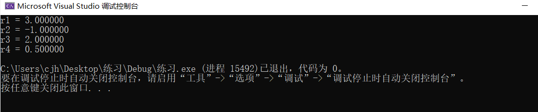 #include <stdio.h> int main() { float x, y; float r1, r2, r3, r4; x = 1; y = 2; r1 = x + y; r2 = x - y; r3 = x * y; r4 = x / y; printf("r1 = %f\n", r1); printf("r2 = %f\n", r2); printf("r3 = %f\n", r3); printf("r4 = %f\n", r4); return 0; }