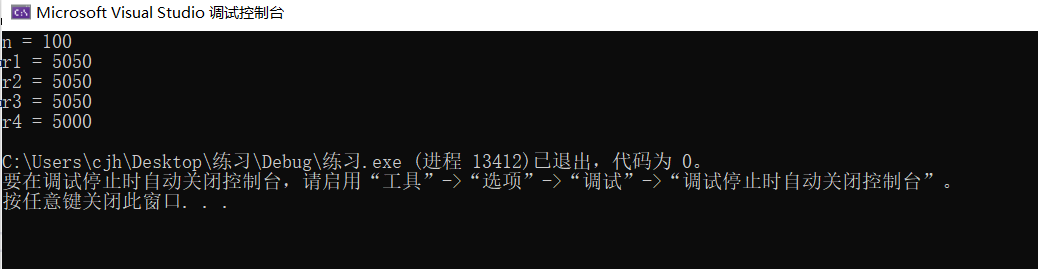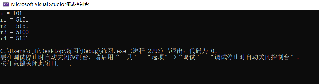 #include <stdio.h> int main() { int n, r1, r2, r3, r4; n = 101; r1 = n*(n+1)/2; r2 = (n+1)*n/2; r3 = n/2*(n+1); r4 = (n+1)/2*n; printf("n = %d\n", n); printf("r1 = %d\n", r1); printf("r2 = %d\n", r2); printf("r3 = %d\n", r3); printf("r4 = %d\n", r4); return 0; }