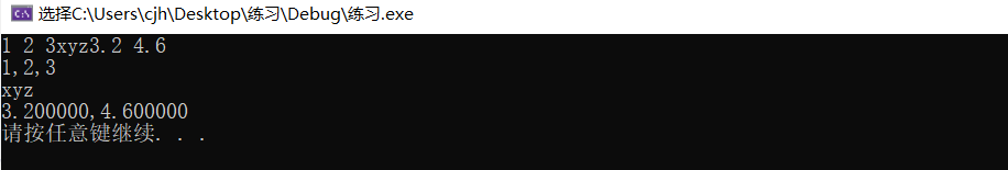#define _CRT_SECURE_NO_WARNINGS #include<stdio.h> #include<stdlib.h> int main() { double x, y; char c1, c2, c3; int a1, a2, a3; scanf("%d%d%d", &a1, &a2, &a3); printf("%d,%d,%d\n", a1, a2, a3); scanf("%c%c%c", &c1, &c2, &c3); printf("%c%c%c\n", c1, c2, c3); scanf("%lf%lf", &x, &y); printf("%lf,%lf\n", x, y); system("pause"); return 0; }