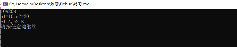 #define _CRT_SECURE_NO_WARNINGS #include<stdio.h> #include<stdlib.h> int main() { int a1, a2; char c1, c2; scanf("%d%c%d%c", &a1, &c1, &a2, &c2); printf("a1=%d,a2=%d\n", a1, a2); printf("c1=%c,c2=%c\n", c1, c2); system("pause"); return 0; }