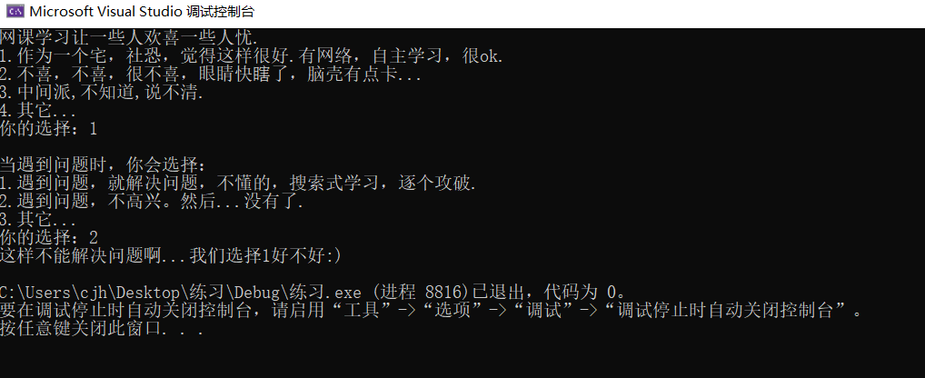 #define _CRT_SECURE_NO_WARNINGS #include<stdio.h> int main() { int answer; char words[5000]; printf("网课学习让一些人欢喜一些人忧.\n"); printf("1.作为一个宅,社恐,觉得这样很好.有网络,自主学习,很ok.\n"); printf("2.不喜,不喜,很不喜,眼睛快瞎了,脑壳有点卡...\n"); printf("3.中间派,不知道,说不清.\n"); printf("4.其它...\n"); printf("你的选择:"); scanf("%d", &answer); if (answer == 4) { printf("请补充说明你的想法:\n"); getchar(); gets_s(words); } printf("\n"); printf("当遇到问题时,你会选择:\n"); printf("1.遇到问题,就解决问题,不懂的,搜索式学习,逐个攻破.\n"); printf("2.遇到问题,不高兴。然后...没有了.\n"); printf("3.其它...\n"); printf("你的选择:"); scanf("%d", &answer); if (answer == 1) printf(":)\n"); else if (answer == 2) printf("这样不能解决问题啊...我们选择1好不好:)\n"); else if (answer == 3) { printf("请补充说明你的想法:\n"); getchar(); gets_s(words); } return 0; }