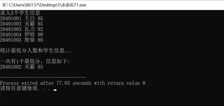 #include <stdio.h> #define N 5 // 定义结构体类型struct student,并定义STU为其别名 typedef struct student { long no; char name[20]; int score; } STU; // 函数声明 void input(STU s[], int n); int findMinlist(STU s[], STU t[], int n); void output(STU s[], int n); int main() { STU stu[N], minlist[N]; int count; printf("录入%d个学生信息\n", N); input(stu, N); printf("\n统计最低分人数和学生信息...\n"); count = findMinlist(stu, minlist, N); printf("\n一共有%d个最低分,信息如下:\n", count); output(minlist, count); return 0; } // 输入n个学生信息,存放在结构体数组s中 void input(STU s[], int n) { int i; for (i = 0; i < n; i++) scanf("%ld %s %d", &s[i].no, s[i].name, &s[i].score); } // 输出结构体s中n个元素信息 void output(STU s[], int n) { int i; for (i = 0; i < n; i++) printf("%ld %s %d\n", s[i].no, s[i].name, s[i].score); } // 在结构体数组s中,查找最低分学生的记录,将其存入结构体数组t中 // 形参n是结构体数组s中元素个数 // 函数返回最低分的学生人数 int findMinlist(STU s[], STU t[], int n) { // 补足函数实现 // ××× }