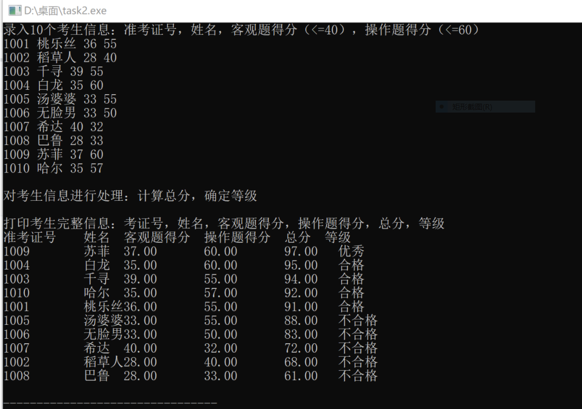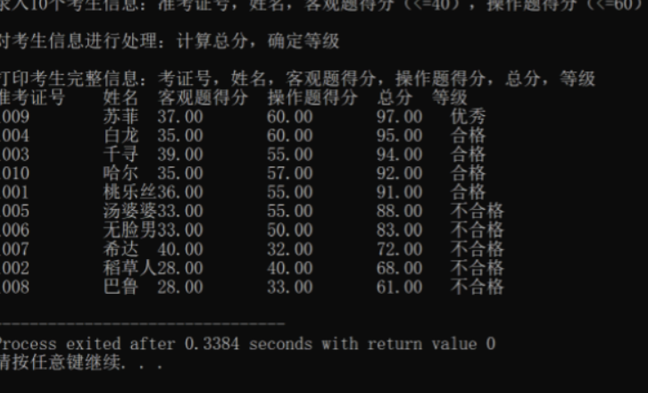 #include<stdio.h> #include<string.h> #define N 10 typedef struct student { long int id; char name[20]; float objective; float subjective; float sum; char level[10]; }STU; void input(STU s[], int n); void output(STU s[], int n); void process(STU s[], int n); int main() { STU stu[N]; printf("录入%d个考生信息:准考证号,姓名,客观题得分(<=40),操作题得分(<=60)\n", N); input(stu, N); printf("\n对考生信息进行处理:计算总分,确定等级\n"); process(stu, N); printf("\n打印考生完整信息:考证号,姓名,客观题得分,操作题得分,总分,等级\n"); output(stu, N); return 0; } void input(STU s[], int n) { int i; for (i = 0; i < n; i++) scanf_s("%ld %s %f %f", &s[i].id, s[i].name, &s[i].objective, &s[i].subjective); } void output(STU s[], int n) { int i; printf("准考证号 姓名 客观题得分 操作题得分 总分 等级\n"); for (i = 0; i < n; i++) printf("%-12ld%-6s%-12.2f%-12.2f%-8.2f%s\n", s[i].id, s[i].name, s[i].objective, s[i].subjective, s[i].sum, s[i].level); } void process(STU s[], int n) { int i, j; STU t; for (i = 0; i < n; i++) s[i].sum = s[i].objective + s[i].subjective; for (i = 0; i < n - 1; i++) { t = s[i]; for (j = i + 1; j < n; j++) { if (s[i].sum < s[j].sum) { t = s[j]; s[j] = s[i]; s[i] = t; } } } for (i = 0; i < n; i++) { if ((i + 1) <= n / 10) strcpy_s(s[i].level, "优秀"); else if ((i + 1) > n / 10 && (i + 1) <= n / 2) strcpy_s(s[i].level, "合格"); else strcpy_s(s[i].level, "不合格"); } }