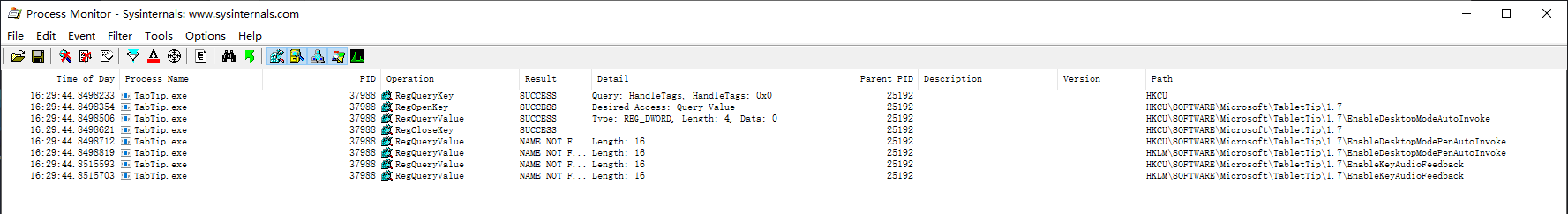 抱着试试看的状态, 手动更改注册表为 0, 但发现并不会生效, 当点击输入框的时候, 触摸键盘依旧还会出现。基于此,请出了 Process Monitor 工具, 来看看在设置应用操作开关能立马生效的时候, TabTip.exe 做了啥? 而我手动更改注册表, TabTip.exe 又做了啥?
