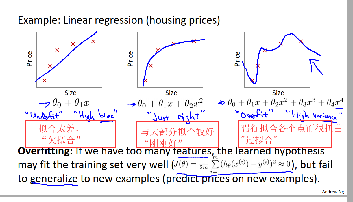 A:当特征数过多时,方程阶数可能很高,导致曲线可能去尽力拟合每一个数据,导致曲线极度扭曲。可以说是“特化”过于严重。而我们机器学习是希望通过一些特化的训练集得到一个相对泛化的结果,能够去预测新的值,而现在特化严重,在预测新的值的时候就会出现很大的偏差,但在训练时却发现代价函数J几乎为0
