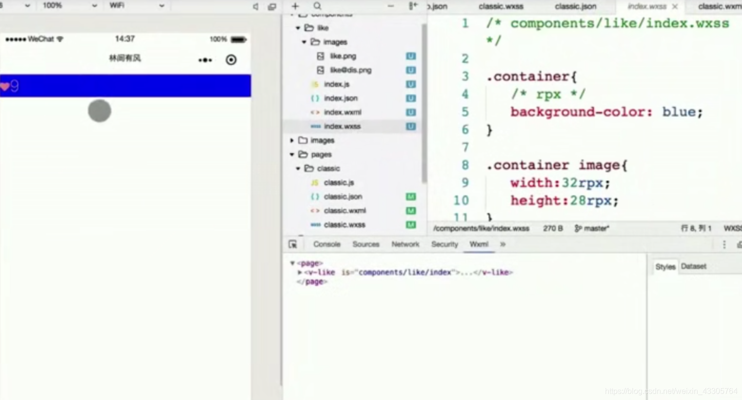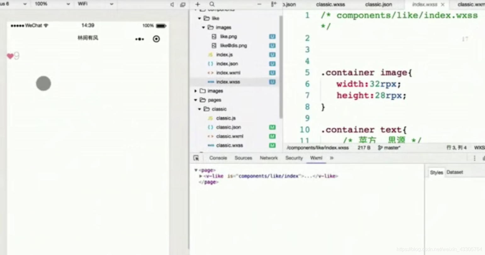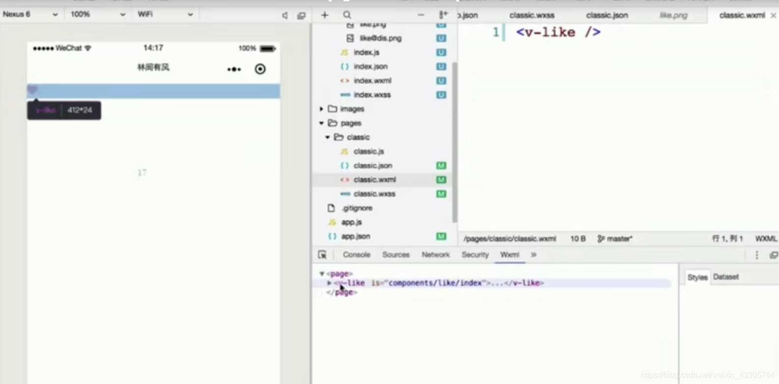 这时,在模拟器中,我们可以看到v-like组件的内容就显示在了要显示该组件的wxml上