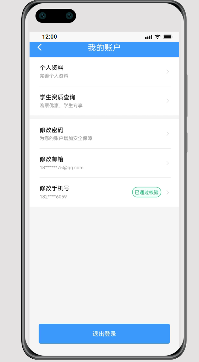 界面组成:我的账户相关信息,返回按钮,退出登录