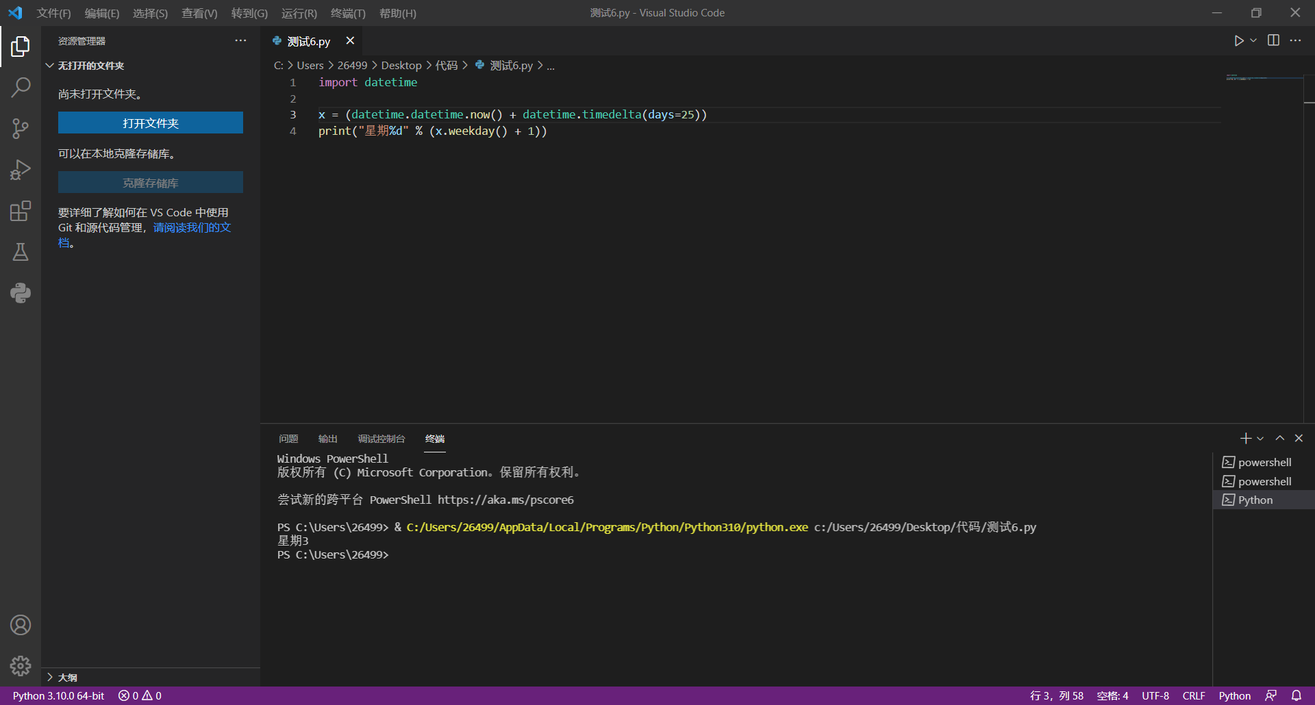 x = (datetime.datetime.now() + datetime.timedelta(days=25)) print("星期%d" % (x.weekday() + 1))