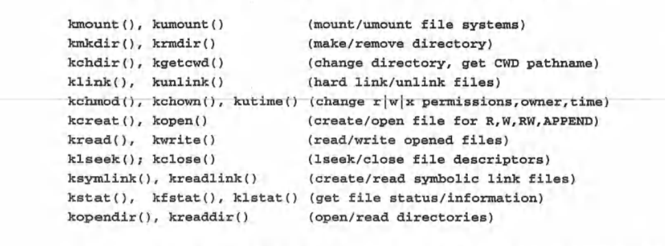 - mkdir,rmdir,cd,pwd,ls,link,unlink,rm,cat,cp,mv,chmod,etc.