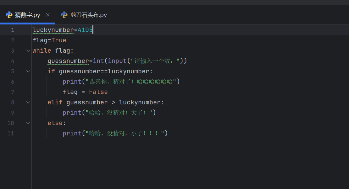 b.在明确了游戏规则后,我开始了程序的编写。首先我选择了我的学号后四位“4105”作为luckynumber,为了满足程序能够让玩家重复多次进行猜测的需求,我创建了while循环机制;同时,为了让程序能够对玩家猜测的数字是大了还是小了给出相应的提示,我运用了if语句;此外,为了实现“玩家猜中数字后进程终止”的要求,我运用了flag赋值的方法。