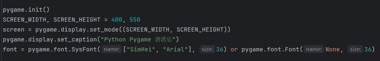 接着设计游戏页面,尽可能实现游戏窗口的美观性,通过SCREEN_WIDTH,SCREEN_HEIGHT=400,550定义窗口尺寸;设置标题为“PythonPygame消消乐”;通过font=pygame.font.SysFont(["SimHei","Arial"],36)orpygame.font.Font(None,36)尝试设置字体。