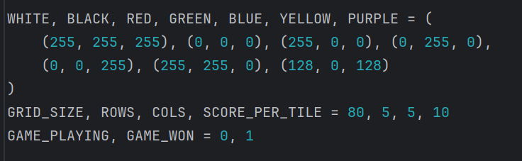 GRID_SIZE, ROWS, COLS, SCORE_PER_TILE = 80, 5, 5, 10