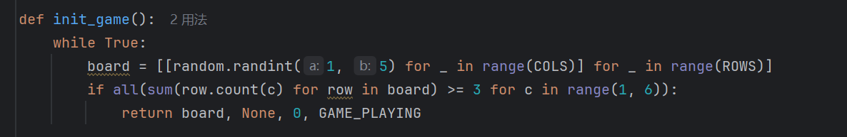 (3)应用init_game()函数初始化消消乐游戏,通过while函数构建循环。使用[random.randint(1,5)for_inrange(COLS)]for_inrange(ROWS)生成二维列表,其中每个元素是1到5之间的随机整数,代表不同颜色的方块。通过all(sum(row.count(c)forrowinboard)>=3forcinrange(1,6))检查每种颜色(1-5)在棋盘board中的数量是否都至少为3个。若满足该条件,说明棋盘布局合理,避免无法完成消除。
