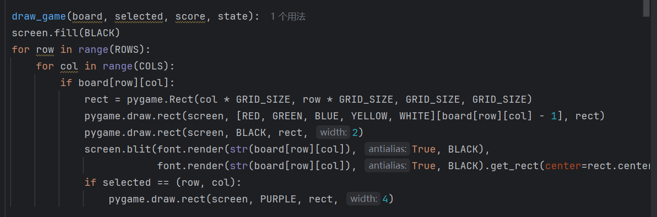 (4)下面使用draw_game()绘制游戏界面。首先,通过screen.fill(BLACK)让黑色填充整个屏幕。然后,通过两层嵌套的for循环遍历棋盘的每一个格子。根据GRID_SIZE确定方块在屏幕上的区域,使用pygame.draw.rect函数,依据方块颜色编号选择对应的颜色绘制方块填充区域,再绘制宽度为2的黑色边框;之后,使用font.render生成方块中心表示颜色编号的文本,并通过screen.blit将其绘制在方块中心位置;若selected与当前方块坐标(row,col)相等,说明当前方块是被选中状态,为了让用户看的更清楚,则再绘制一个宽度为4的紫色边框来突出显示选中状态。