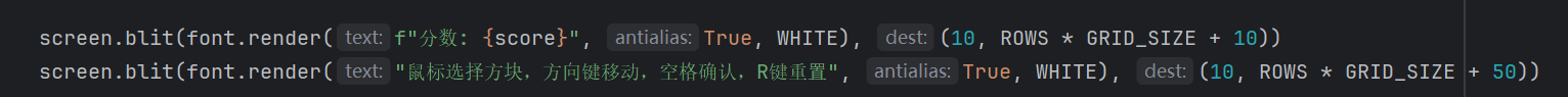 (5)接着在游戏界面上绘制文字信息。通过font.render使用之前定义的字体,以白色渲染显示当前分数的文本,文本内容为“分数:具体分数值”,再通过screen.blit将渲染后的文本绘制到屏幕上指定位置,让玩家能实时看到自己的得分。设置提示文本"鼠标选择方块,方向键移动,空格确认,R键重置",然后将其绘制在屏幕上稍低于分数显示的位置,帮助玩家了解游戏玩法。