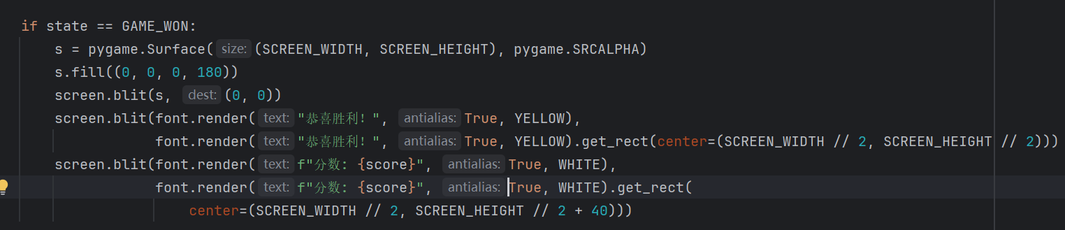 (6)接着绘制游戏胜利界面的部分。当游戏状态state等于GAME_WON时,使用之前定义的字体分别渲染“恭喜胜利!”文本和最终分数文本,让玩家在游戏胜利时能看到祝贺信息和最终得分。