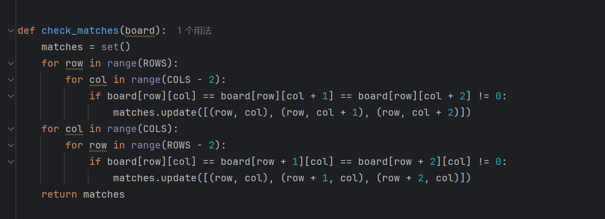 (7)下面运用check_matches()函数检测棋盘上可消除的方块组合。创建一个空集合matches,用于存储可消除方块的坐标。接着,通过两层嵌套循环遍历棋盘的每一行,在每行中从左到右检查连续三个方块,当这三个方块颜色相同时,将它们的坐标添加到集合matches中,以此检测水平方向的可消除组合。再通过另外两层嵌套循环遍历棋盘的每一列,从上到下检查连续三个方块,若这三个方块颜色相同,就把它们的坐标添加到集合matches,用于检测垂直方向的可消除组合。这一步骤为之后的消除操作提供了依据。