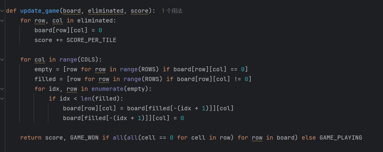 (8)通过update_game()函数更新游戏状态。接收棋盘、要消除的方块坐标集合以及当前分数作为参数,将对应的棋盘方块值设为0来表示消除,并按每个方块对应的分数增加当前分数。接着,按列处理方块下落,对每一列分别找出空行和有方块的行(filled列表存储有方块的行号),然后通过遍历空行列表,将有方块行中的方块依次下移到空行位置,实现方块下落效果。最后,检查整个棋盘是否所有方块都为0,若全为0则表示游戏胜利,返回更新后的分数score和游戏胜利状态GAME_WON。