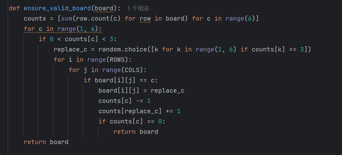 (9)通过ensure_valid_board()函数确保棋盘状态始终满足可消除条件。若发现某种颜色的数量大于0且小于3,意味着该颜色方块数量过少,难以形成可消除组合。此时,从数量不少于3的颜色中随机选择一种作为替换颜色。