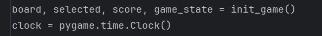 (10)调用init_game()函数,获取游戏初始化的结果,分别将返回的棋盘状态赋值给board、当前选中方块状态赋值给selected、初始分数赋值给score、游戏初始状态赋值给game_state,为游戏启动准备好初始数据。创建一个Clock对象,用于控制游戏的帧率。在Pygame中,通过该对象可以设置每秒的帧数,从而控制游戏画面更新的速度,避免游戏运行过快或过慢,保证游戏的流畅性和稳定性。
