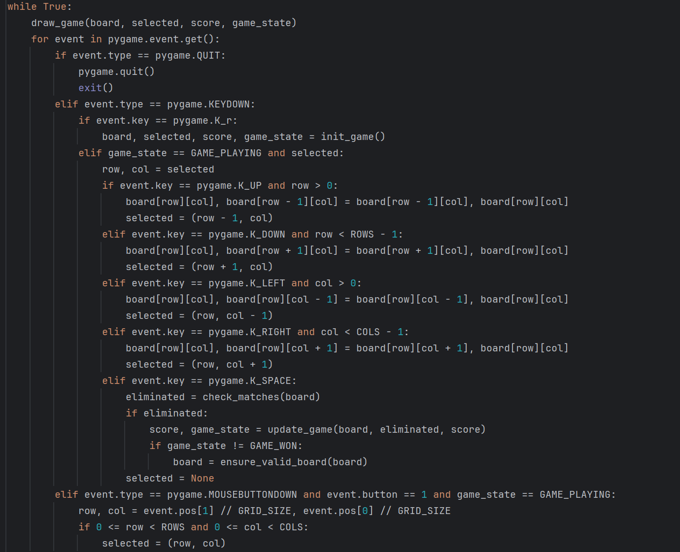 (11)下面编写游戏的主循环代码。通过while函数构建循环,持续运行游戏。每次循环先调用draw_game()渲染游戏画面,呈现棋盘、分数等信息。接着,使用pygame.event.get()遍历用户输入事件:若event.type是pygame.QUIT,即用户点击关闭窗口,调用pygame.quit()退出Pygame并结束程序;若为pygame.KEYDOWN(按键按下事件),按R键时重新初始化游戏;游戏进行中且有方块选中时,方向键可移动选中方块,按空格键则检测可消除方块,有可消除方块时更新游戏状态,并在未胜利时修复棋盘,之后取消方块选中;若event.type是pygame.MOUSEBUTTONDOWN且鼠标左键点击(event.button==1),在游戏进行中且点击位置在棋盘内时,选中对应方块。