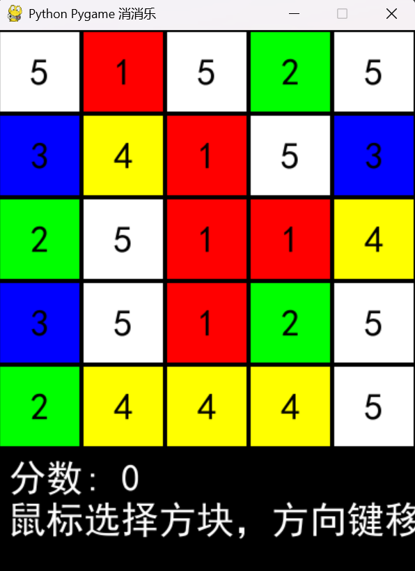至此,游戏程序已全部编写完成,我尝试运行了游戏程序,用鼠标点击任意一个方块,选中的方块会被紫色边框高亮显示。选中方块后,通过键盘方向键可以将选中的方块与相邻方块交换位置。移动完成后,按空格键确认操作,当横向或纵向出现3个或更多连续相同颜色的方块时,这些方块会被消除。消除的方块会消失并得分。经测试,程序运行正常!!!(完结撒花~)