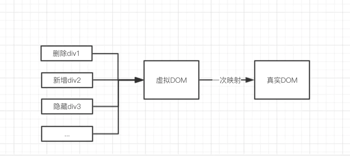 而虚拟DOM可以帮我们收集短时间来的多次改动,汇总成为一次改动。这样对于浏览器来说,压力就减少了很多。如图。