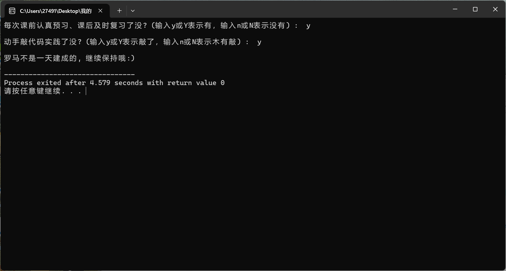 printf("\n罗马不是一天建成的, 继续保持哦:)\n");