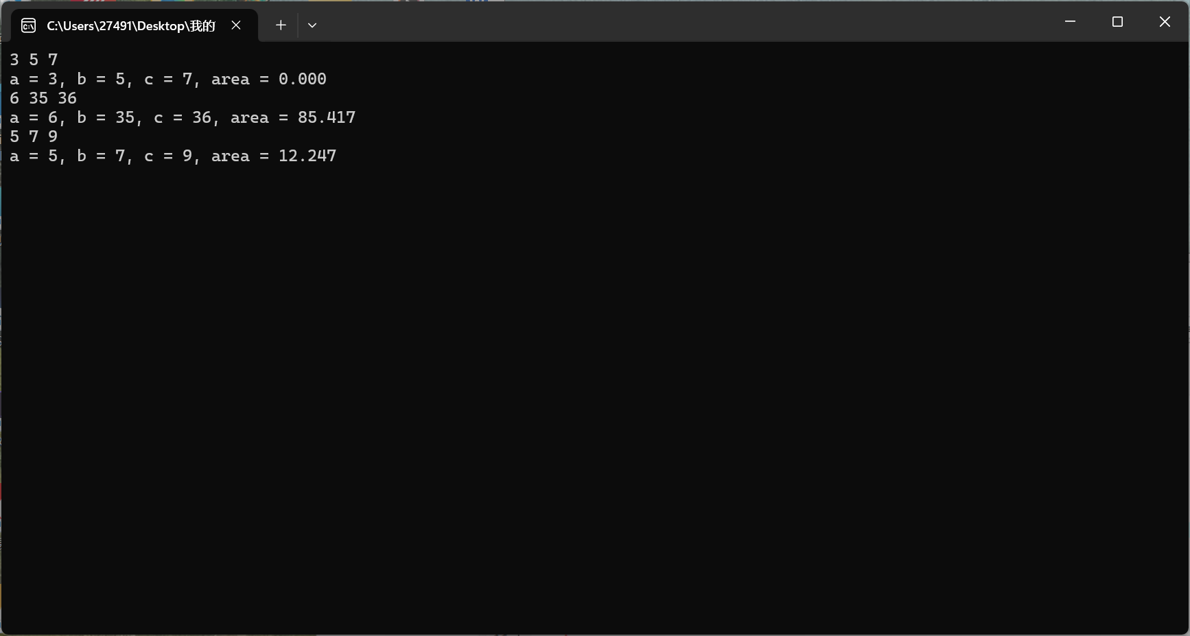 printf("a = %d, b = %d, c = %d, area = %.3f", a,b,c,mj);