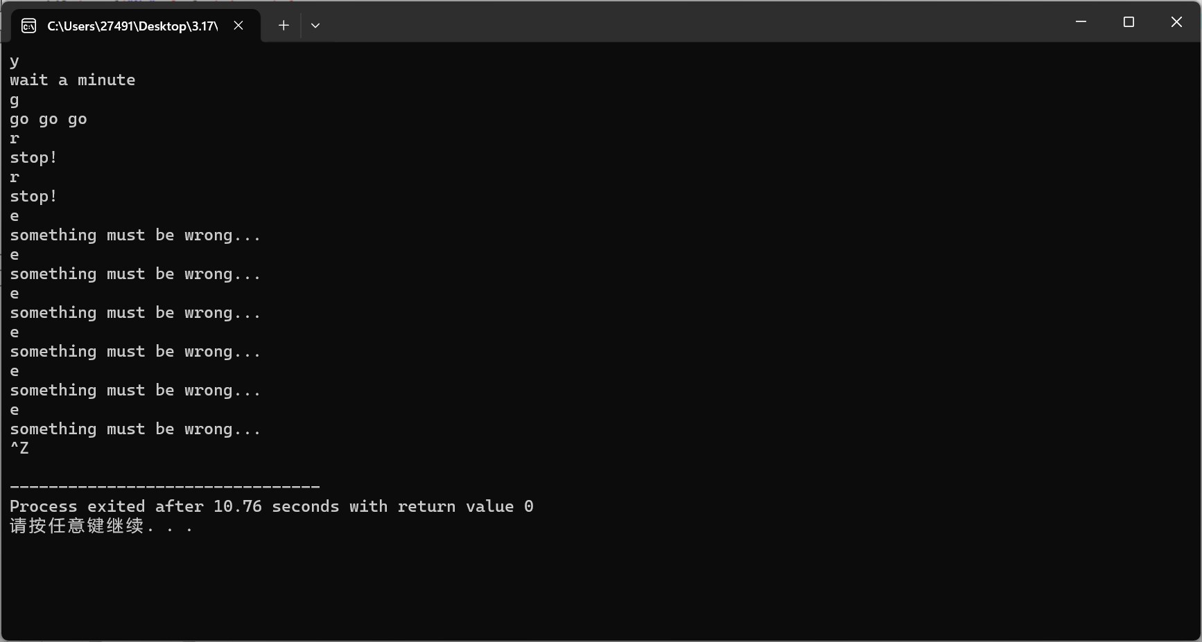 #include <stdio.h> #include <math.h> int main() { char color; while(scanf("%c", &color) != EOF) { getchar(); switch(color) { case 'r': printf("stop!\n"); break; case 'g': printf("go go go\n"); break; case 'y': printf("wait a minute\n"); break; default: printf("something must be wrong...\n"); break; } } }