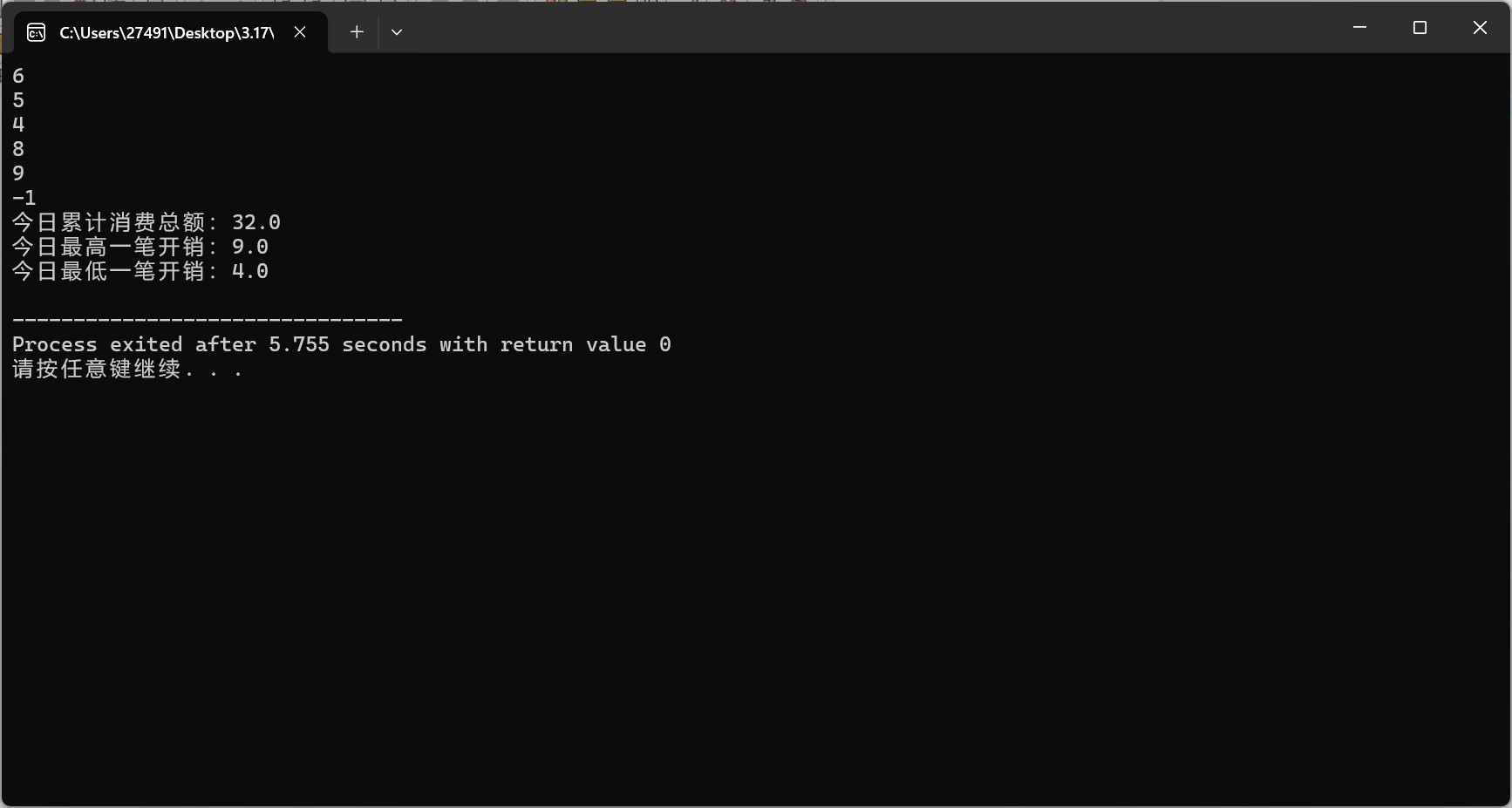 #include <stdio.h> #include <math.h> int main() { double a, s, max, min; s=0; scanf("%lf", &a); getchar(); s=s+a; max = a; min = a; while(1) { scanf("%lf", &a); getchar(); if (a==-1) { break; } if (a>max){ max=a; s=s+a; } if (a<min){ min= a; s=s+a; } } printf("今日累计消费总额:%.1f\n", s); printf("今日最高一笔开销:%.1f\n", max); printf("今日最低一笔开销:%.1f\n", min); }