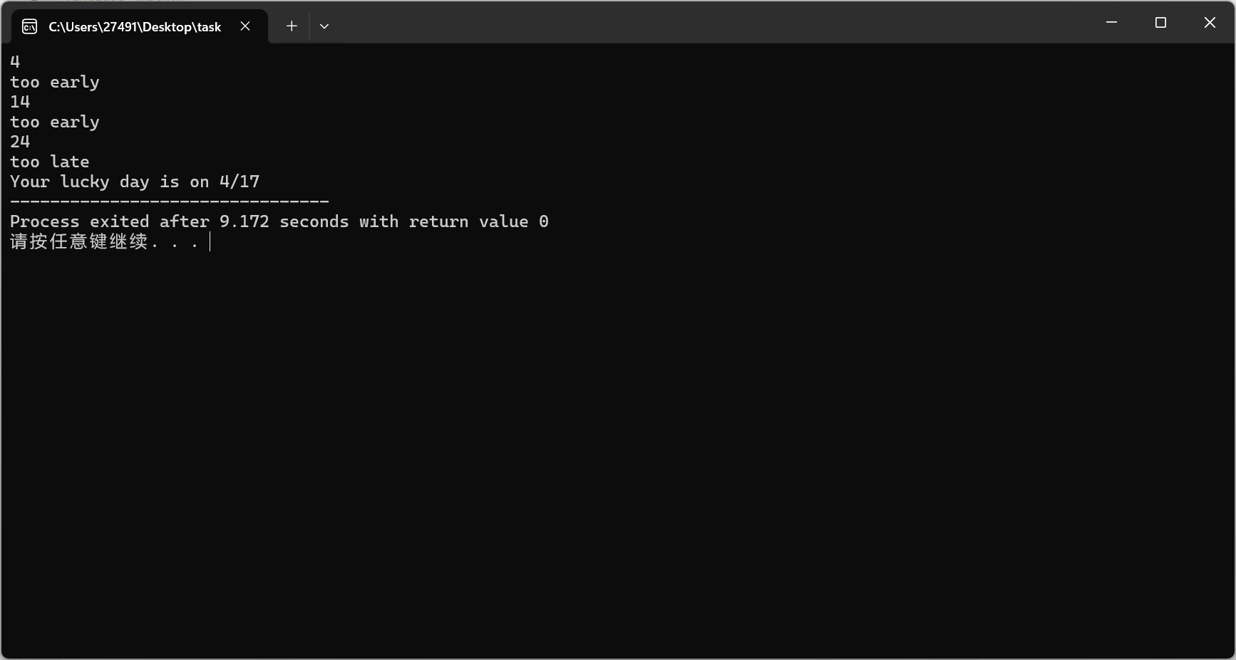#include <stdio.h> #include <math.h> #include <time.h> #include <stdlib.h> int main() { srand(time(0)); int day, g ,i ; day = rand() % 30 + 1; for (i=1; i<4; ) { scanf("%d", &g); if (g< day) { printf("too early\n"); } if (g> day) { printf("too late\n"); } if (g== day) { printf("YOU GUESS IT RIGHT!\n"); break; } i++; if (i==4) { printf("Your lucky day is on 4/%d", day); } } return 0; }