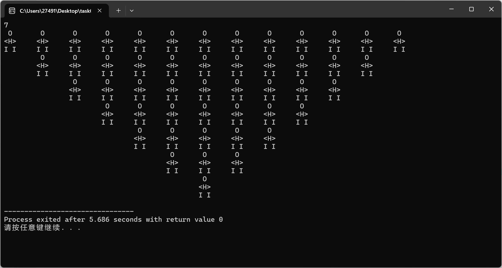 #include <stdio.h> int main() { int n, i, k ; scanf("%d", &n); for (i=n; i>0;i--) { for (k=n-i; k>0; k--) { printf("\t"); } for (k=2*i-1; k>0; k--) { printf(" O \t"); } printf("\n"); for (k=n-i; k>0; k--) { printf("\t"); } for (k=2*i-1; k>0; k--) { printf("<H>\t"); } printf("\n"); for (k=n-i; k>0; k--) { printf("\t"); } for (k=2*i-1; k>0; k--) { printf("I I\t"); } printf("\n"); } return 0; }