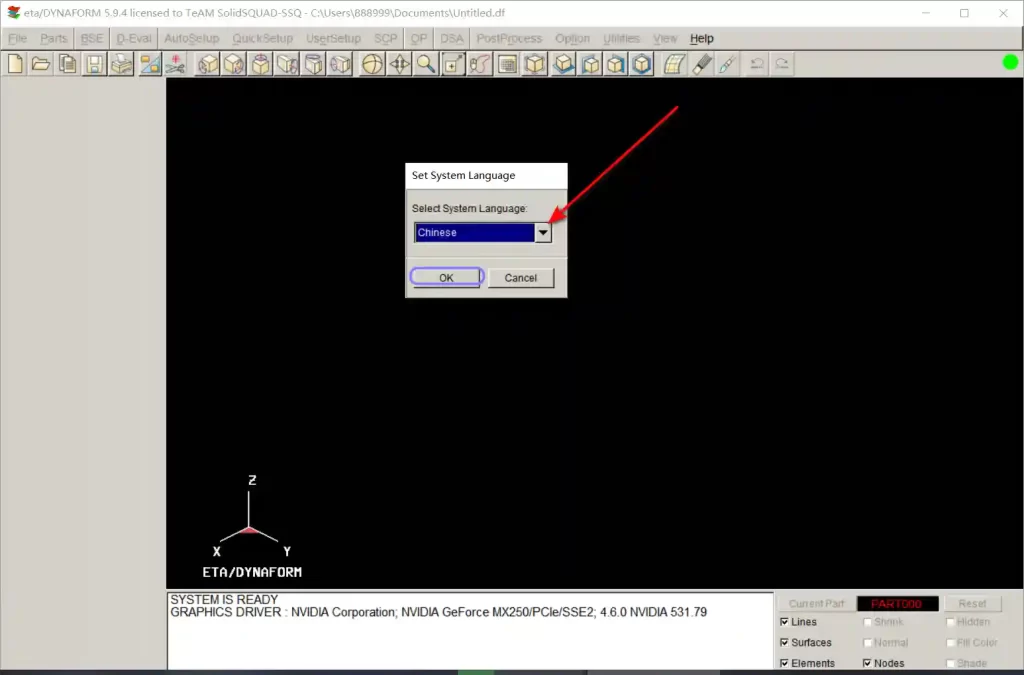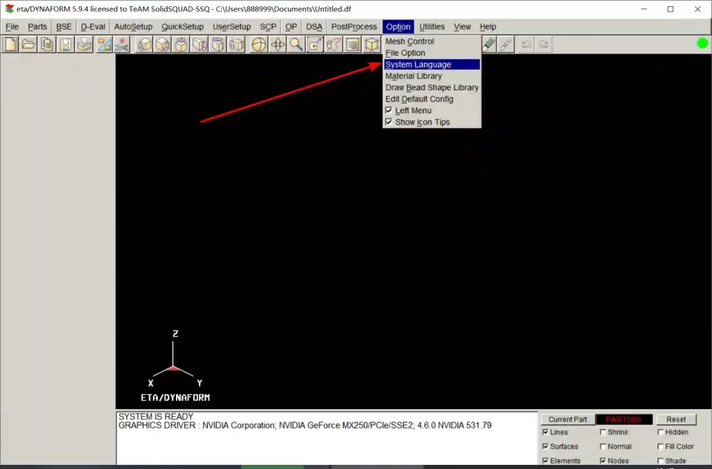 24、双击桌面【Dynaform 5.9.4】图标启动软件,点击菜单栏中的【Options】,选择【System Language】