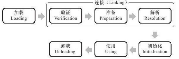 类从被加载到虚拟机内存中开始,到卸载出内存为止,它的整个生命周期包括:加载(Loading)、 验证(Verification)、 准备(Preparation)、 解析(Resolution)、 初始化(Initialization)、 使用(Using)和卸载(Unloading)7个阶段。 其中验证、 准备、 解析3个部分统称为连接(Linking),这7个阶段的发生顺序如图所示。