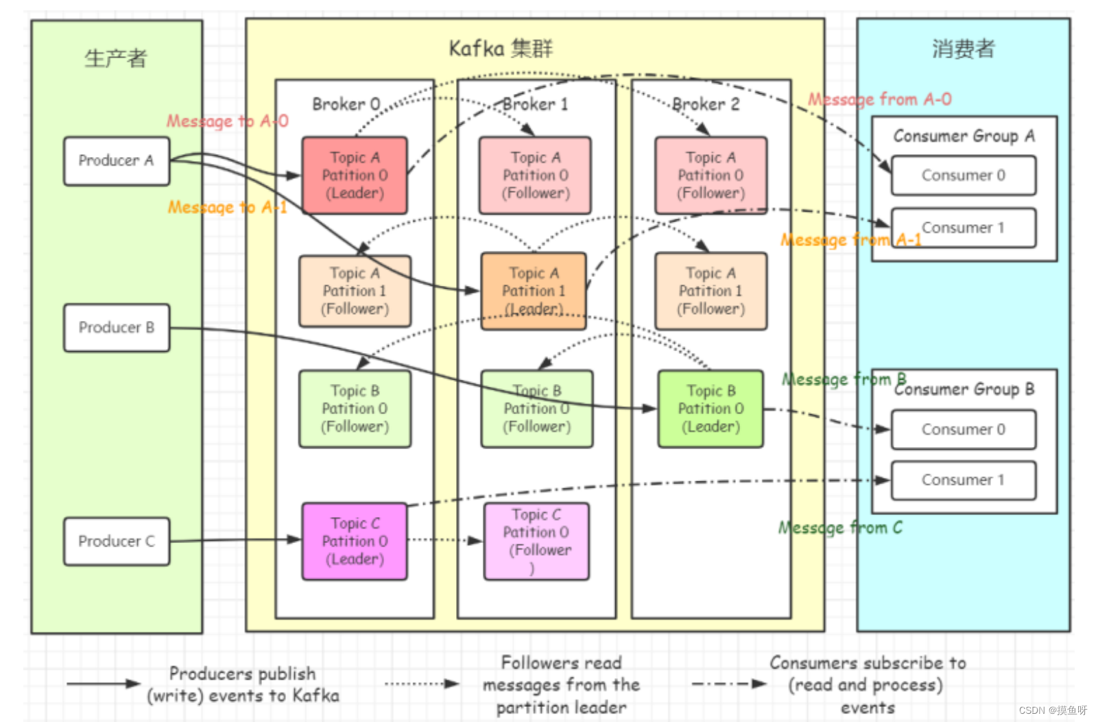 总结起来就是:发送时:异步发送给多个分区消息;写入存储:broker端进行分区管理,顺序且分段写入,MMAP技术;读取时:消费时使用零拷贝从磁盘读取。