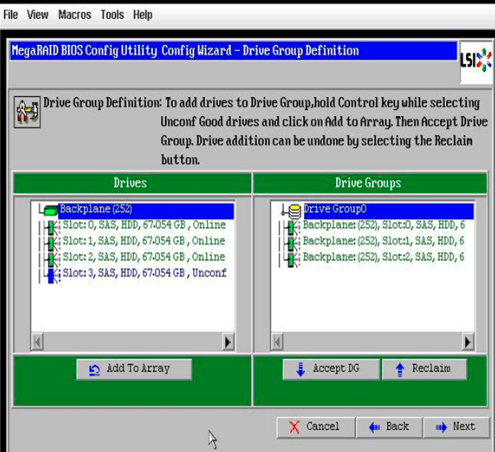 规划是Drive Group0 添加4块,剩下一块盘给到新建组中。在Accept DG添加一个组,再从左侧添加一个硬盘,会自动添加到新组中。 (加完新组后,选择在前面Group0组中添加会跑到新组中,针对这次环境建议是第一个组都添加好后在添加第二个组,在给第二组添加盘)