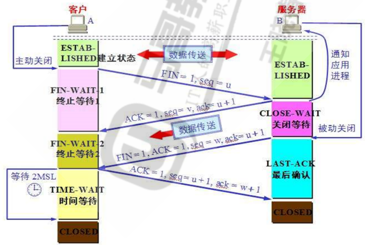 4、当B确认已经没有数据发送给A后,B开始主动关闭从B到A方向的TCP连接,这时会发送一个FIN包,同时ACK设置为1,ack仍然保持不变,是u+1,而seq则为一个新值w,因为进入CLOSE-WAIT之后,B可能还发送了一些数据。B发送完这个FIN+ACK包之后,将进入LAST-ACK(最后确认)状态。