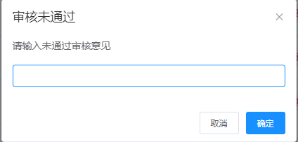 /* 打开审批弹窗*/ openAudit(row) { this.$confirm('请确认审核结果', '审核', { distinguishCancelAndClose: true, confirmButtonText: '审核通过', cancelButtonText: '未通过' }) .then(() => { row.auditStatus = '1' crudFinanceBudgetManage.audit(row).then(resp => { /* 提交后端保存同意结果*/ this.$message({ type: 'success', message: '已审核通过' }) this.crud.refresh() }).catch((action) => { console.log(action) }) }) .catch(action => { if (action === 'cancel') { this.$prompt('请输入未通过审核意见', '审核未通过', { confirmButtonText: '确定', cancelButtonText: '取消', inputPattern: /^.{1,100}$/, inputErrorMessage: '请输入未通过审核意见' }).then(({ value }) => { row.auditStatus = '0' row.suggestion = value crudFinanceBudgetManage.audit(row).then(resp => { /* 提交后端保存同意结果*/ this.$message({ type: 'warning', message: '未通过' }) this.crud.refresh() }).catch((action) => { console.log(action) }) }).catch(() => { this.$message({ type: 'info', message: '取消审核' }) }) } else { console.log(action) } }) },