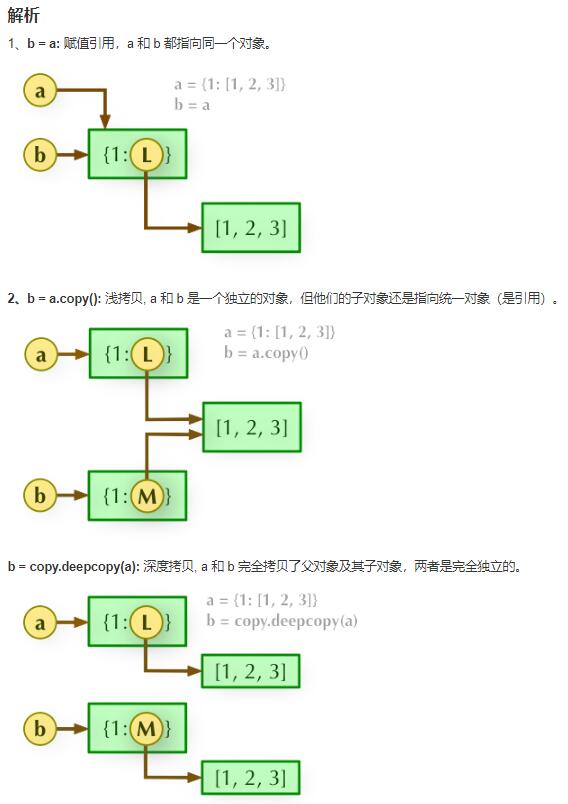 >>>a = {1: [1,2,3]} >>> b = a.copy() >>> a, b ({1: [1, 2, 3]}, {1: [1, 2, 3]}) >>> a[1].append(4) >>> a, b ({1: [1, 2, 3, 4]}, {1: [1, 2, 3, 4]})深度拷贝需要引入 copy 模块: