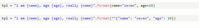 tpl = "i am {2}, age {1}, {0}".format("seven",18,'alex') 可以按照索引取值 0,1,2 代表下表位置后面的相当于元组