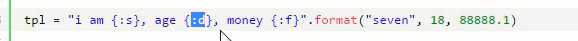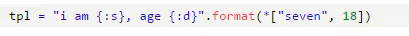 tpl = "i am {}, age {}, {}".format("seven",18,'alex') 输入的值需要与前面的{}一一对应,如果不对应则会出现报错。